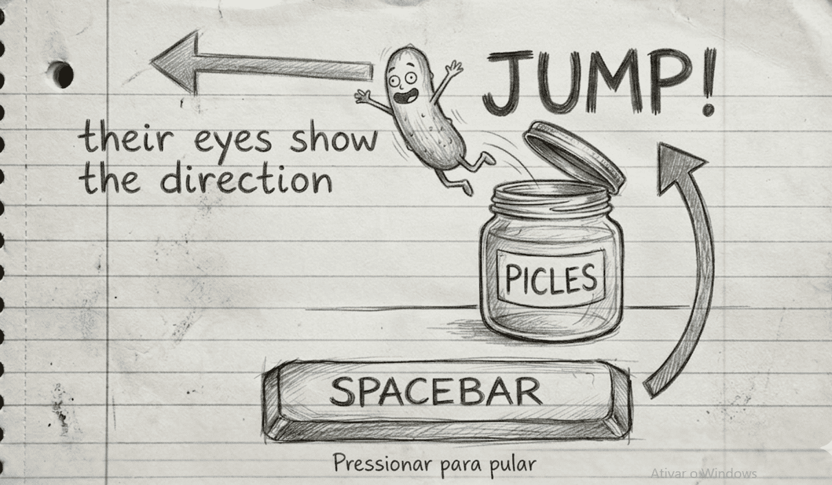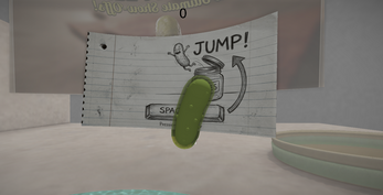 ENGLISH: A forgotten pickle in a jar, who likes to have fun doing acrobatics. -------------------------------------------------------- Instructions: His eyes guide the direction in which he throws himself. You need to collect the 3 pickle pieces scattered around the map (just walk over them), and return to the pickle jar. -------------------------------------------------------- Controls: Mouse: look around Spacebar: jump --------------------------------------------------------- --------------------------------------------------------- PORTUGUÊS: Um picles esquecido num frasco, que gosta de se divertir fazendo acrobacias. -------------------------------------------------------- instruções: Os olhos guiam a direção em que ele se joga. Você precisa coletar os 3 pedaços de picles espalhados pelo mapa (basta passar por cima deles), e voltar para dentro do pote de picles. -------------------------------------------------------- Controles: Mouse: olhar ao redor Spacebar: pular